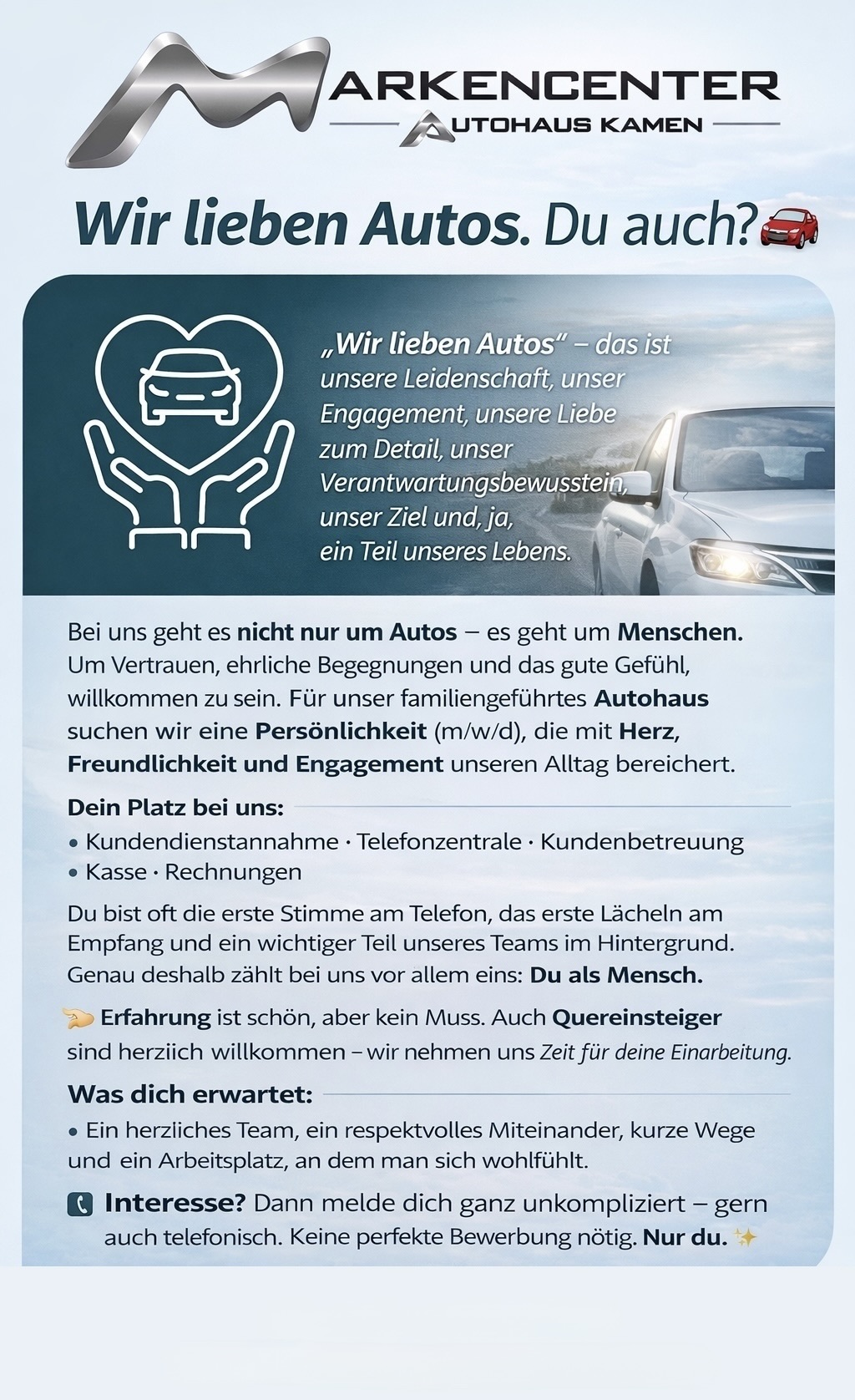 Sie lieben Autos, schätzen Teamarbeit und möchten in einem modernen, zukunftsorientierten Autohaus durchstarten?